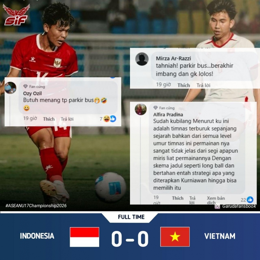 On social media, a wave of criticism from Indonesian fans erupted immediately after the match. Many could not hide their sarcasm: “Congratulations on the bus parking! Enough to draw and enough to be eliminated from the group stage right at home.” This opinion quickly spread, reflecting dissatisfaction with a tactic deemed overly negative.