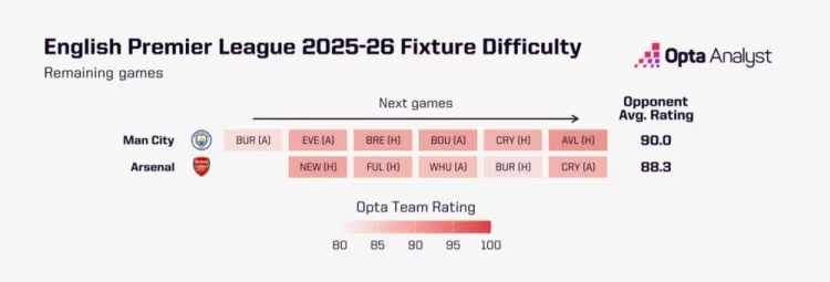 Personal view: whether for Arsenal or Manchester City, the remaining fixtures are challenging, especially Arsenal's away match against West Ham United, where the Hammers' desperate fight for survival in a relegation battle will surely be intense.