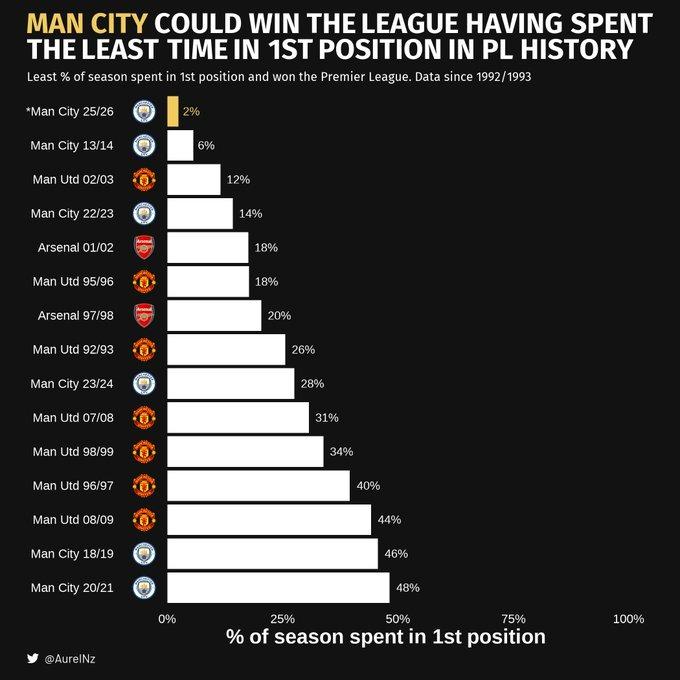 Manchester City could win the Premier League despite having led the table for the least amount of time in history, a scenario that would force Arsenal to face an astonishing collapse.