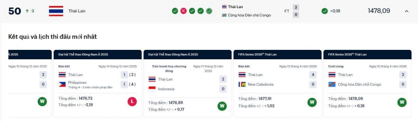 These results helped the Thai women's team increase their total points from 1476.89 to 1478.09, adding 1.2 points. Although the increase is not substantial, it was enough for the team to rise 3 spots, officially entering the 50th position on the FIFA rankings. Simultaneously, they also climbed to 9th place in Asia, significantly improving their regional standing.