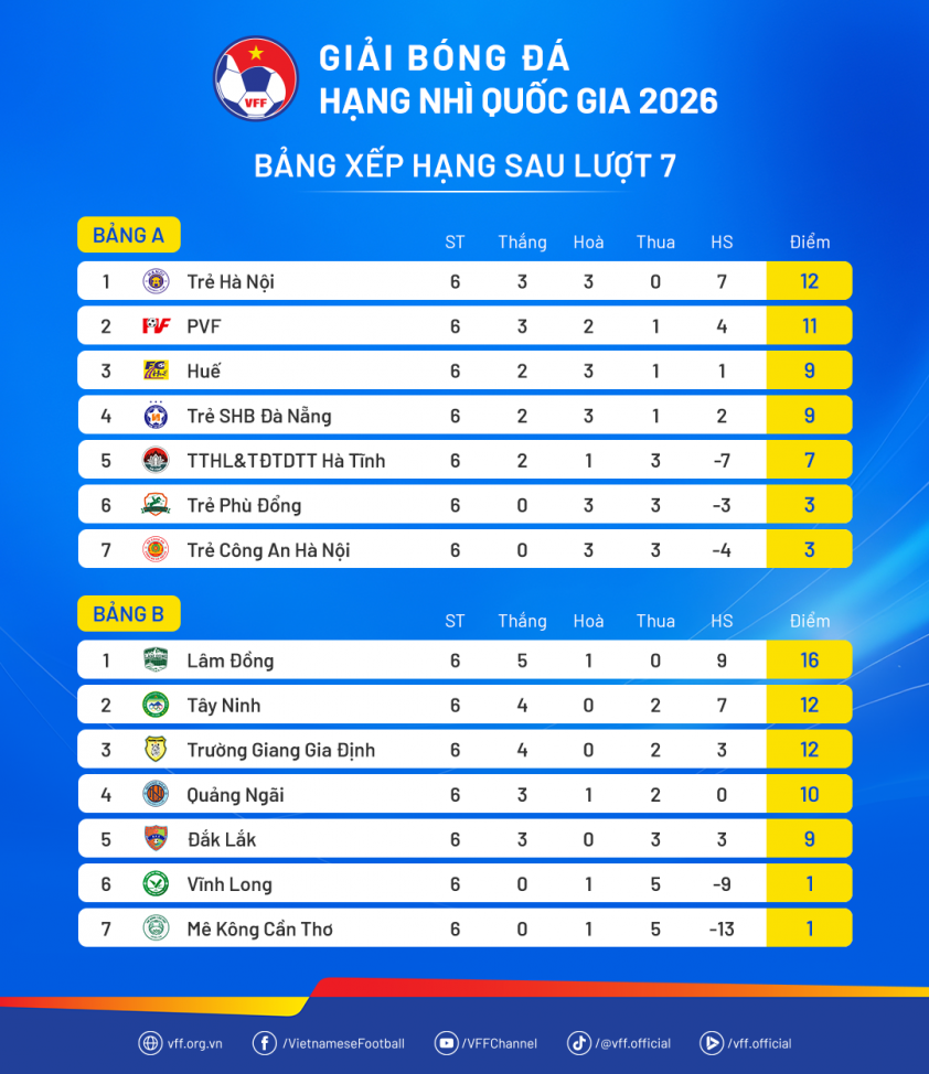On the afternoon of April 25, the first leg of the 2026 National Second Division Football League officially concluded after the matches of round 7 in groups A and B, thus initially outlining the landscape of the promotion race as well as the relegation battle in this season.