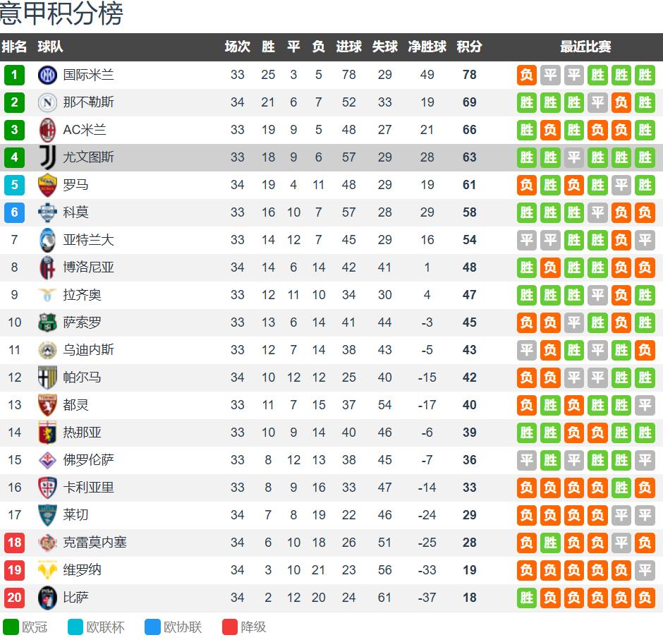First:The situation of both teams! After 33 Serie A rounds, AC Milan has 19 wins, 9 draws, and 5 losses, accumulating 66 points and ranking third, trailing the leader Inter Milan by 12 points. Their league goal this season is to secure a top-four finish for Champions League qualification. Juventus has 18 wins, 9 draws, and 6 losses, accumulating 63 points and ranking fourth, leading fifth-place Roma (who played earlier) by 2 points. Their league goal this season is to ensure a top-four finish for Champions League qualification next season. In the last Serie A round, AC Milan narrowly won 1-0 away against Verona, ending a two-game losing streak but showing offensive weakness; Juventus defeated Bologna 2-0 at home, securing three consecutive league wins.